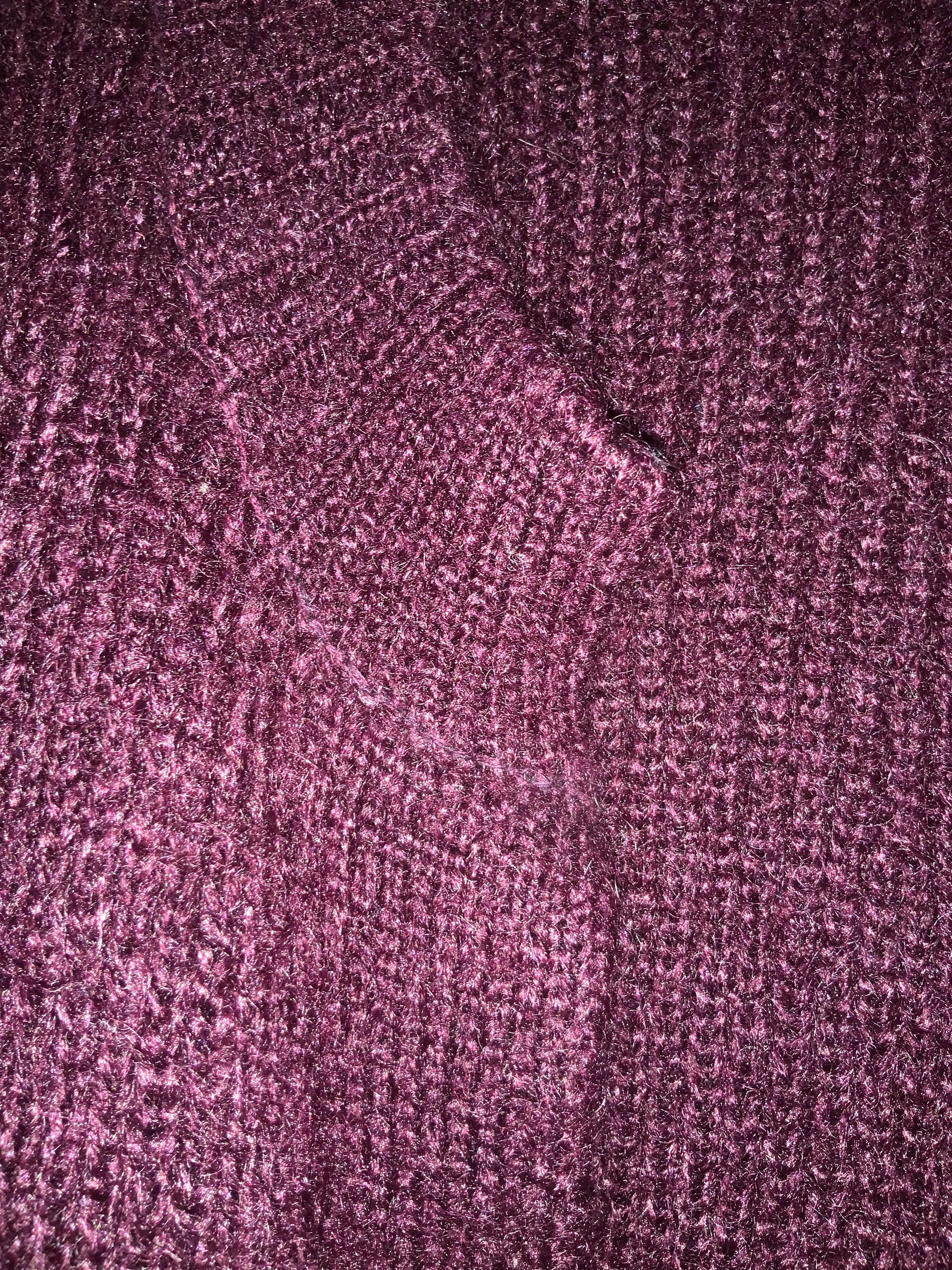 Modèle ras du cou avec col écharpe, bord à bord , 2 poches semi doublées . Très belle maille tricotée large et chaude , finitions bord côte ,très belle couleur .