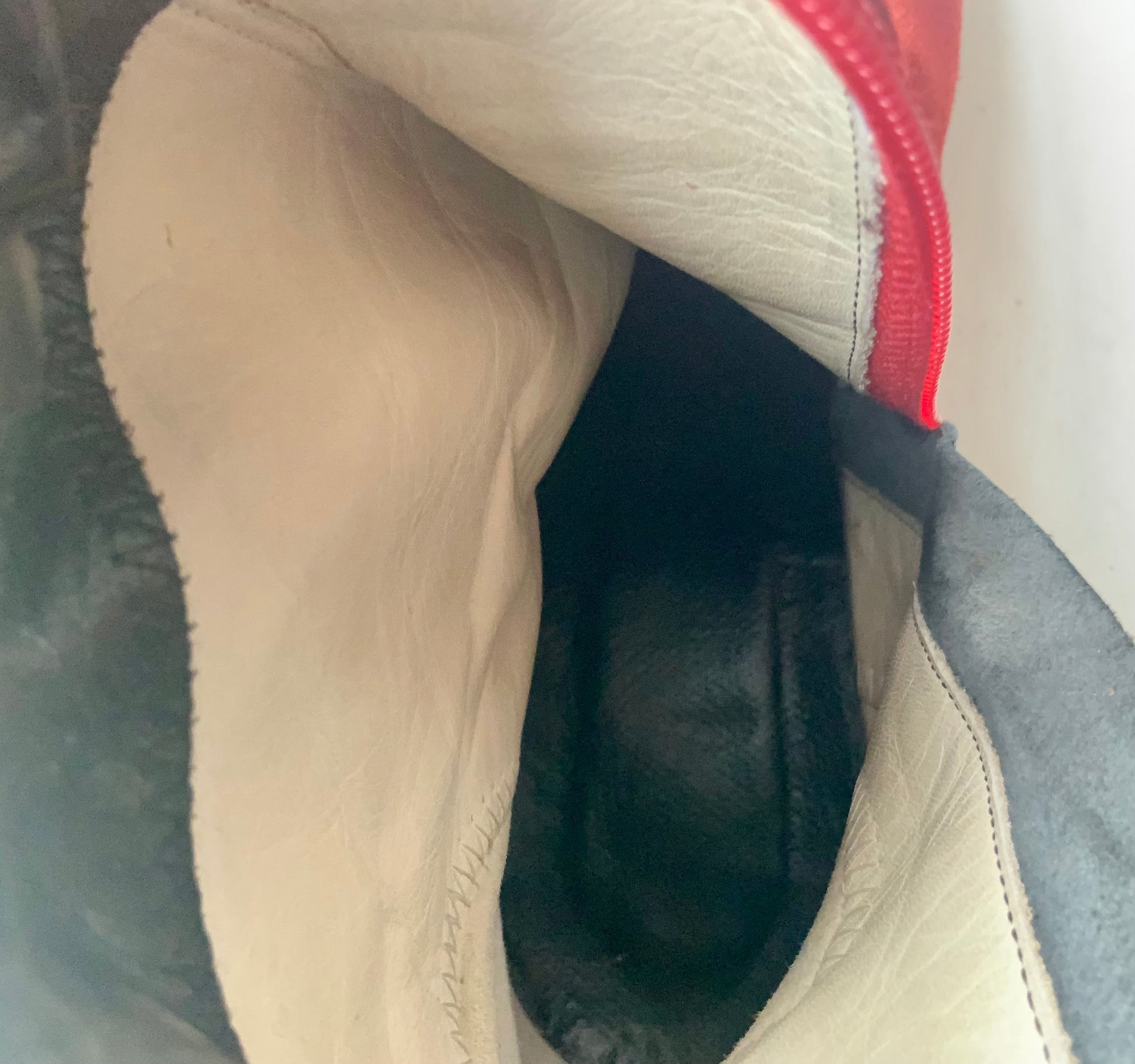 C’est une pièce vintage , elle présente des traces de sa précédente vie (voir photo) avec de petites marques sur le dessus du pied gauche , et les semelles sont d’origine.