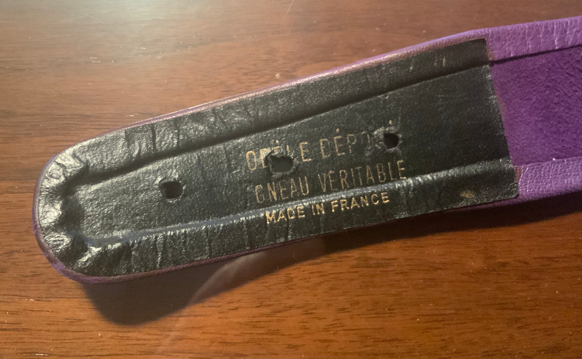 Ceinture en cuir d’agneau très souple, d’un beau violet , ornée d’un noeud au centre, décoré de micro-clous dorés. Fermeture au dos par crochet réglable 3 positions.