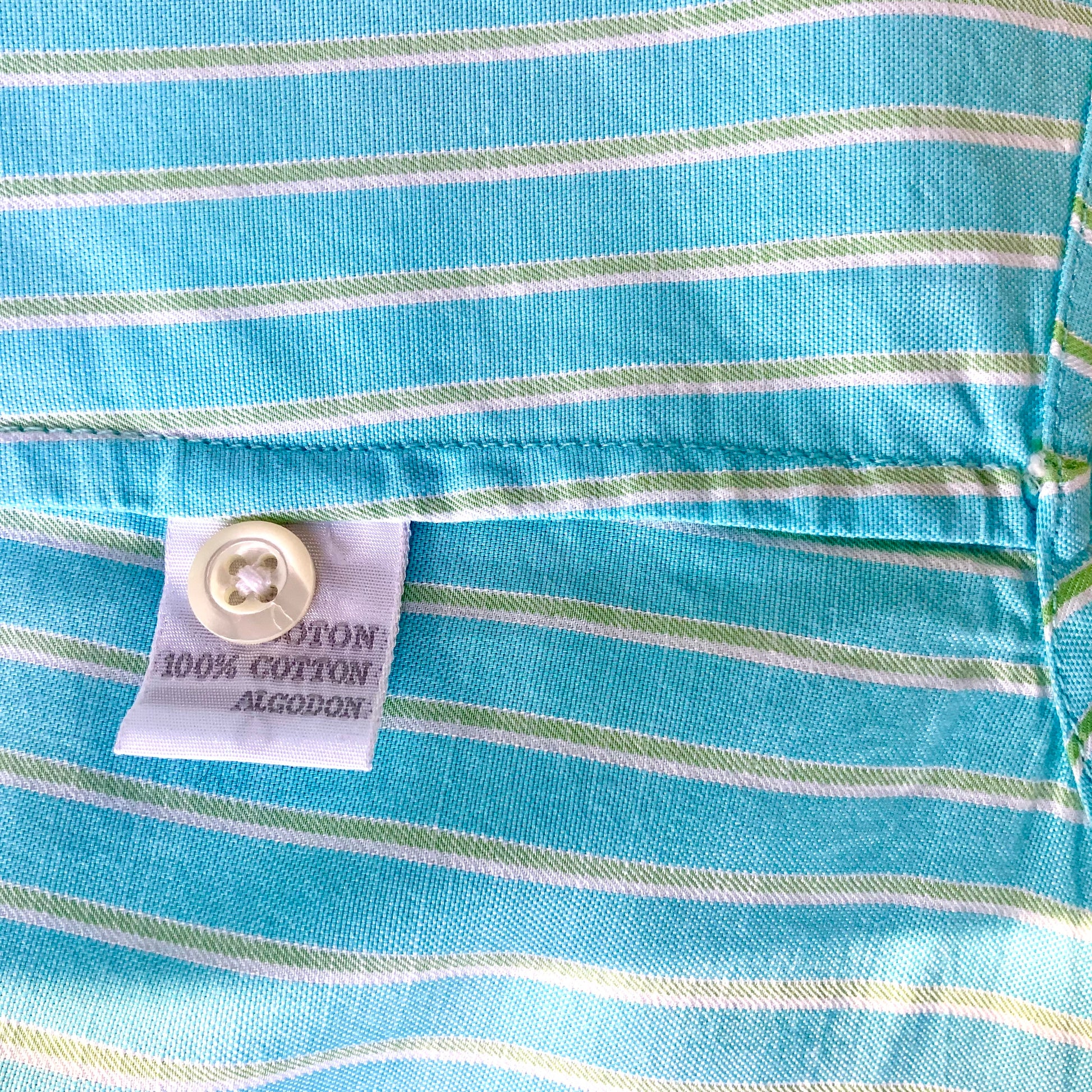 L’intérieur du col et des poignets sont en opposition , rayures turquoises et vertes sur fond blanc.
