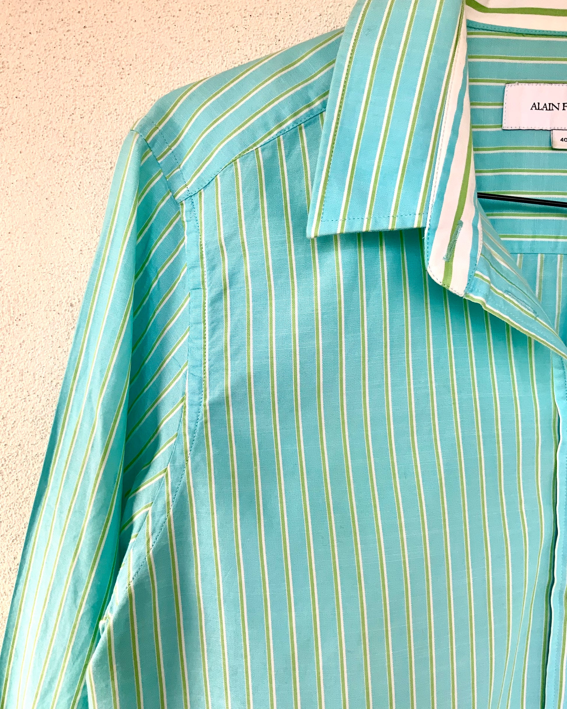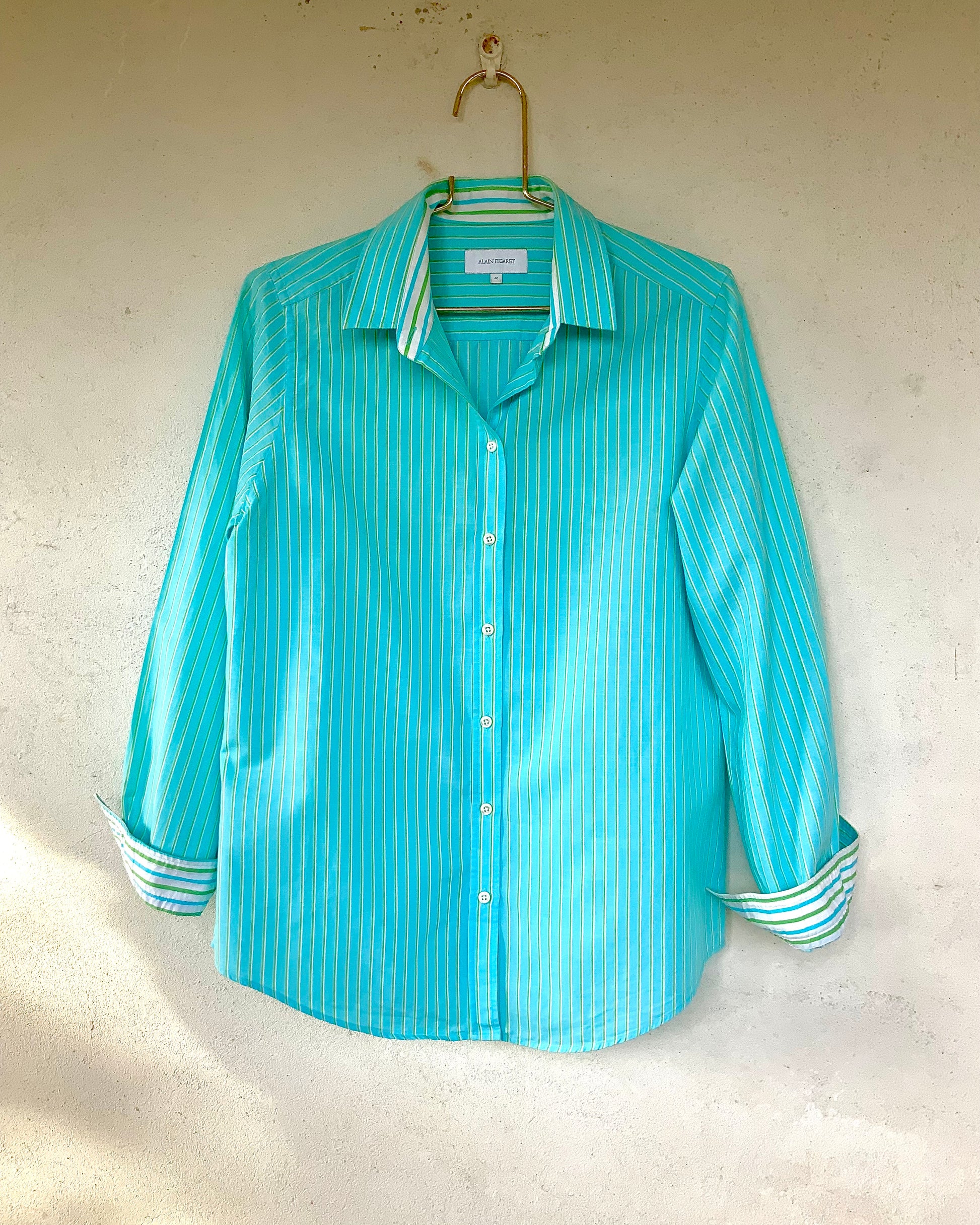 Chemise femme turquoise et rayures vertes et blanches Alain Figaret vintage
