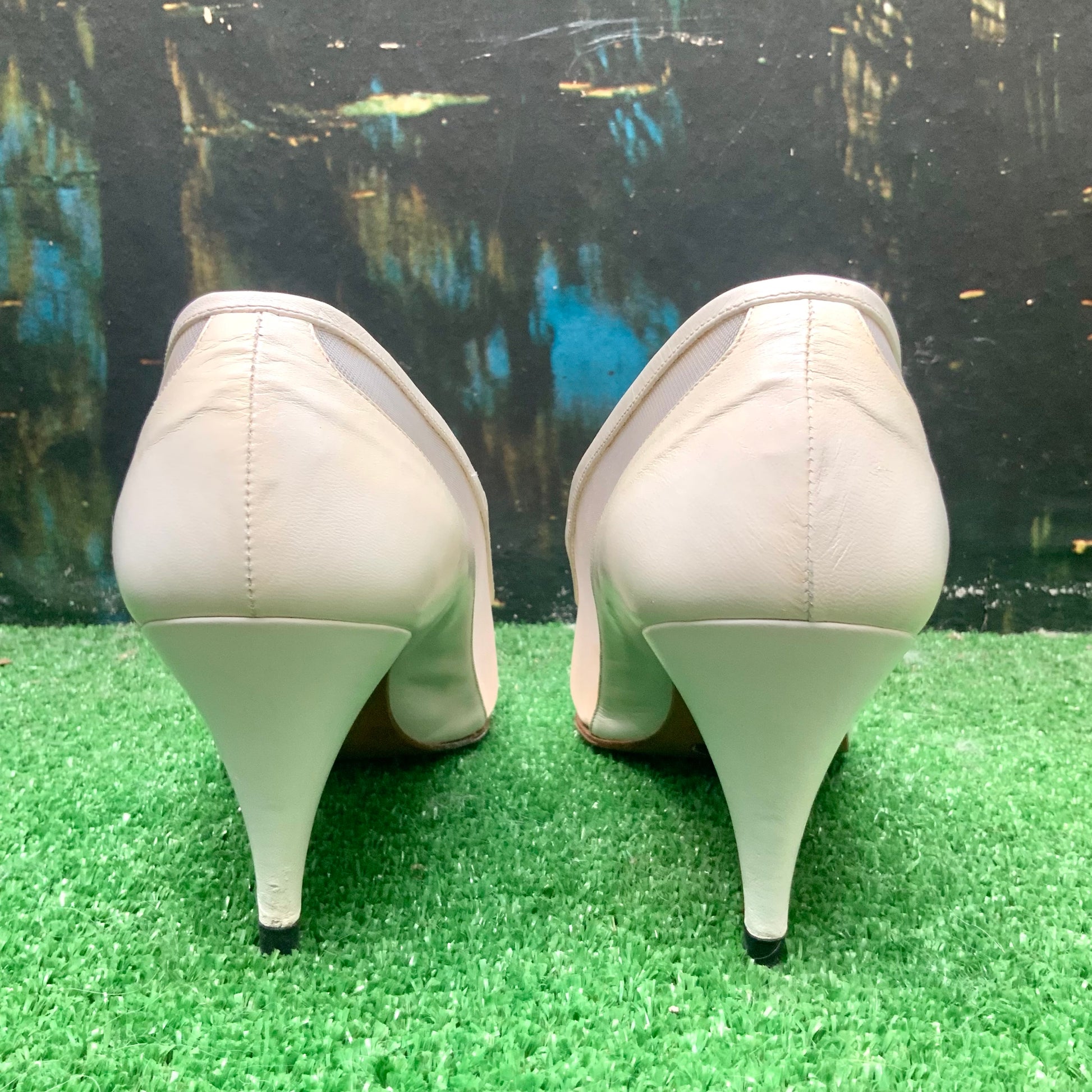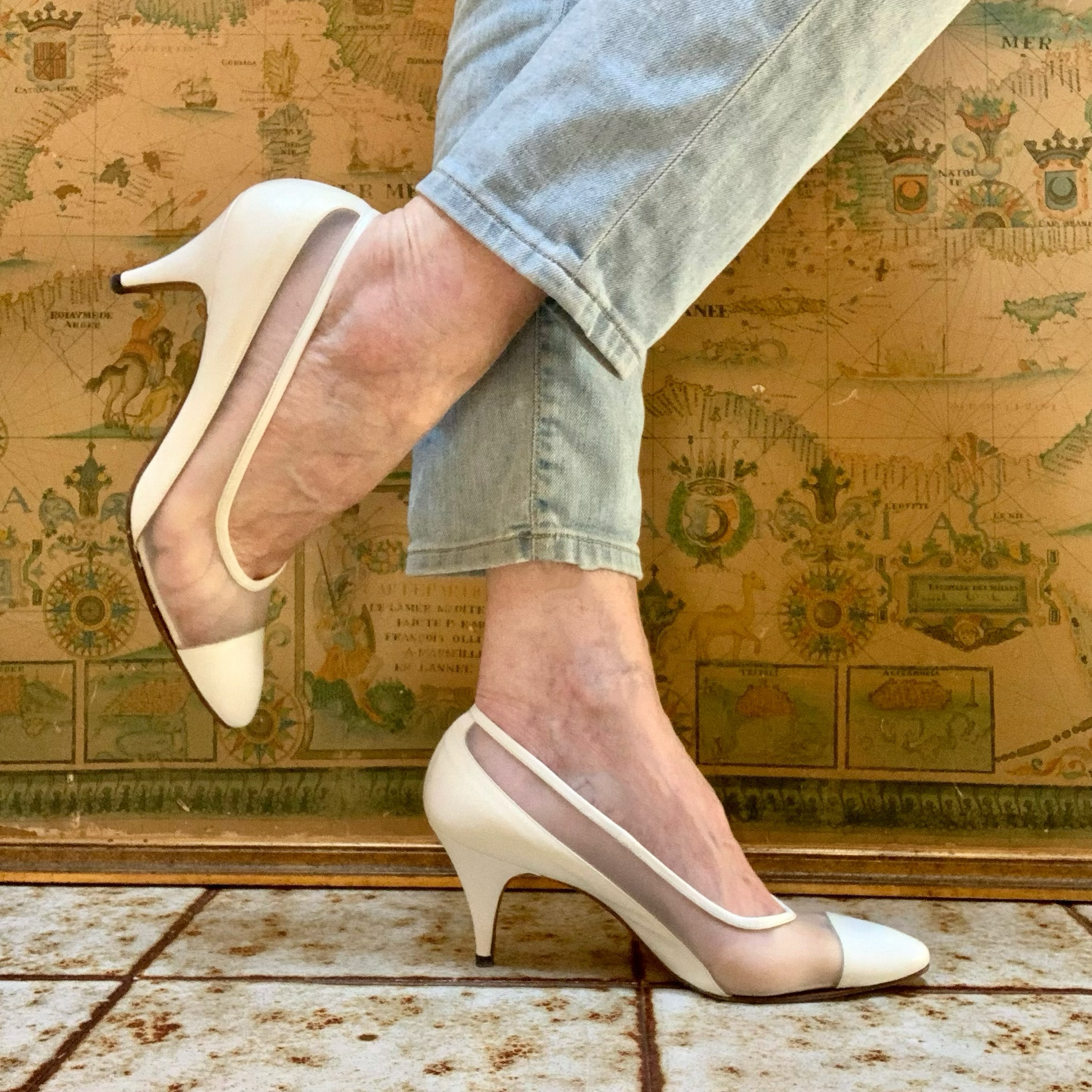 Vintage années 80 , pour ces superbes escarpins en cuir blanc et micro résille blanche.