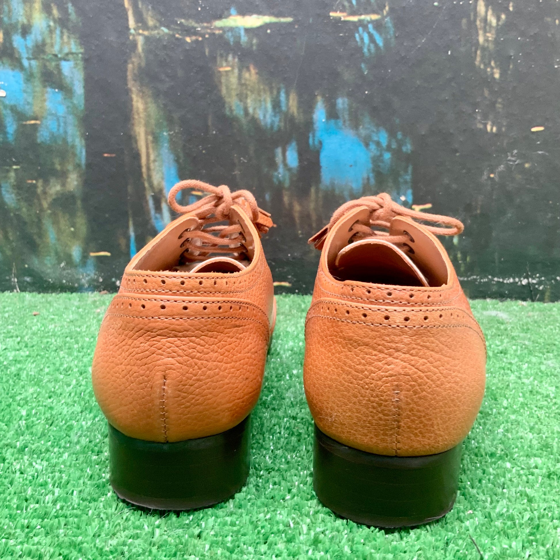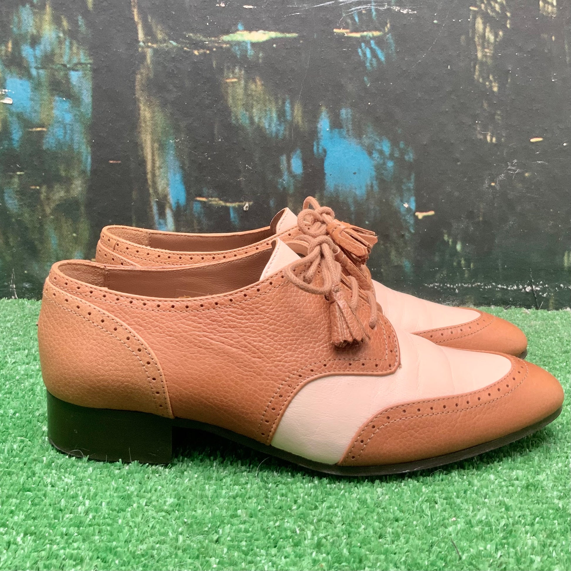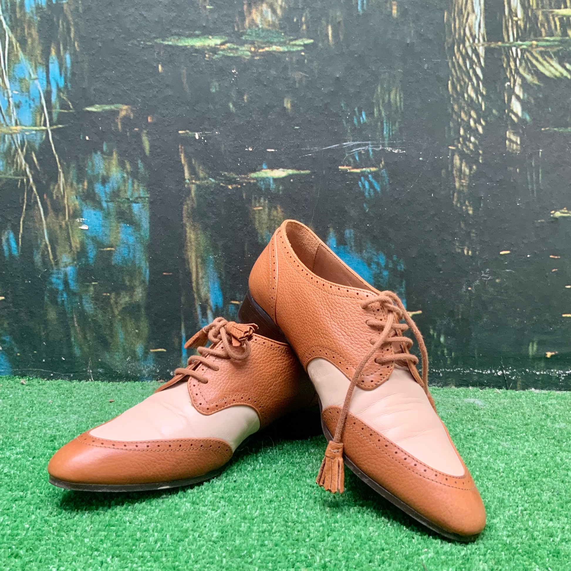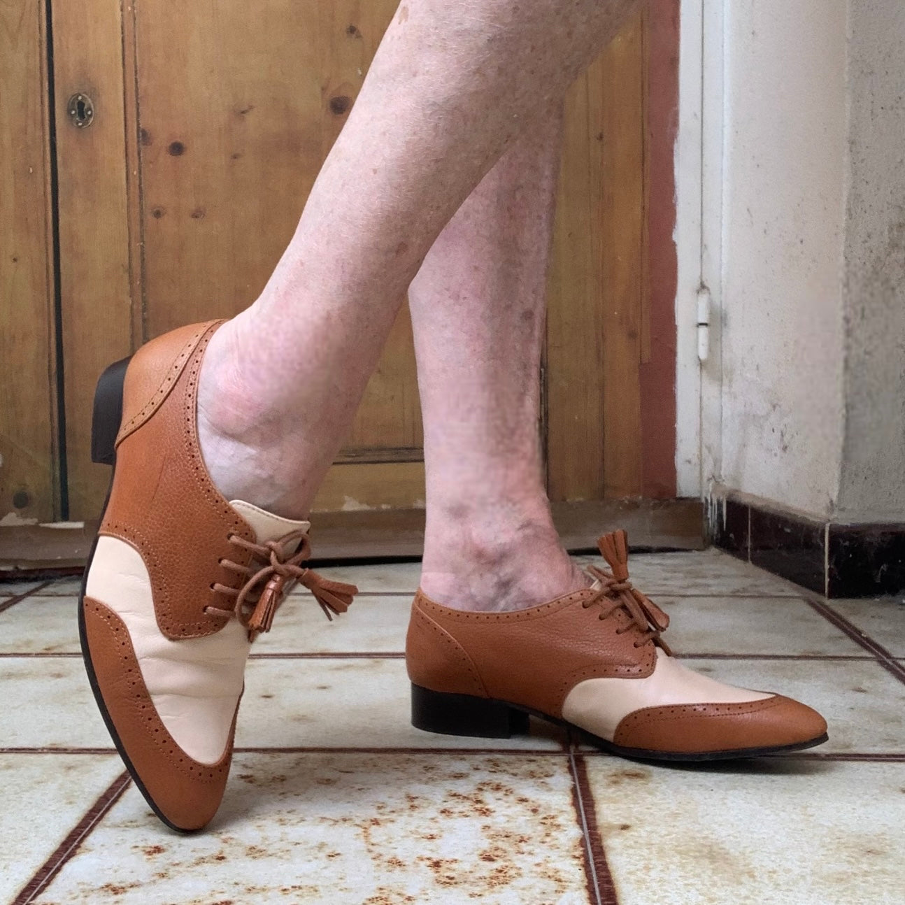 C’est ainsi que le modèle 1930 apparaît , derbys en cuir bicolore écru et camel, avec des détails couture comme, les lacets terminés par des pompons frangés et le mélange des cuirs.