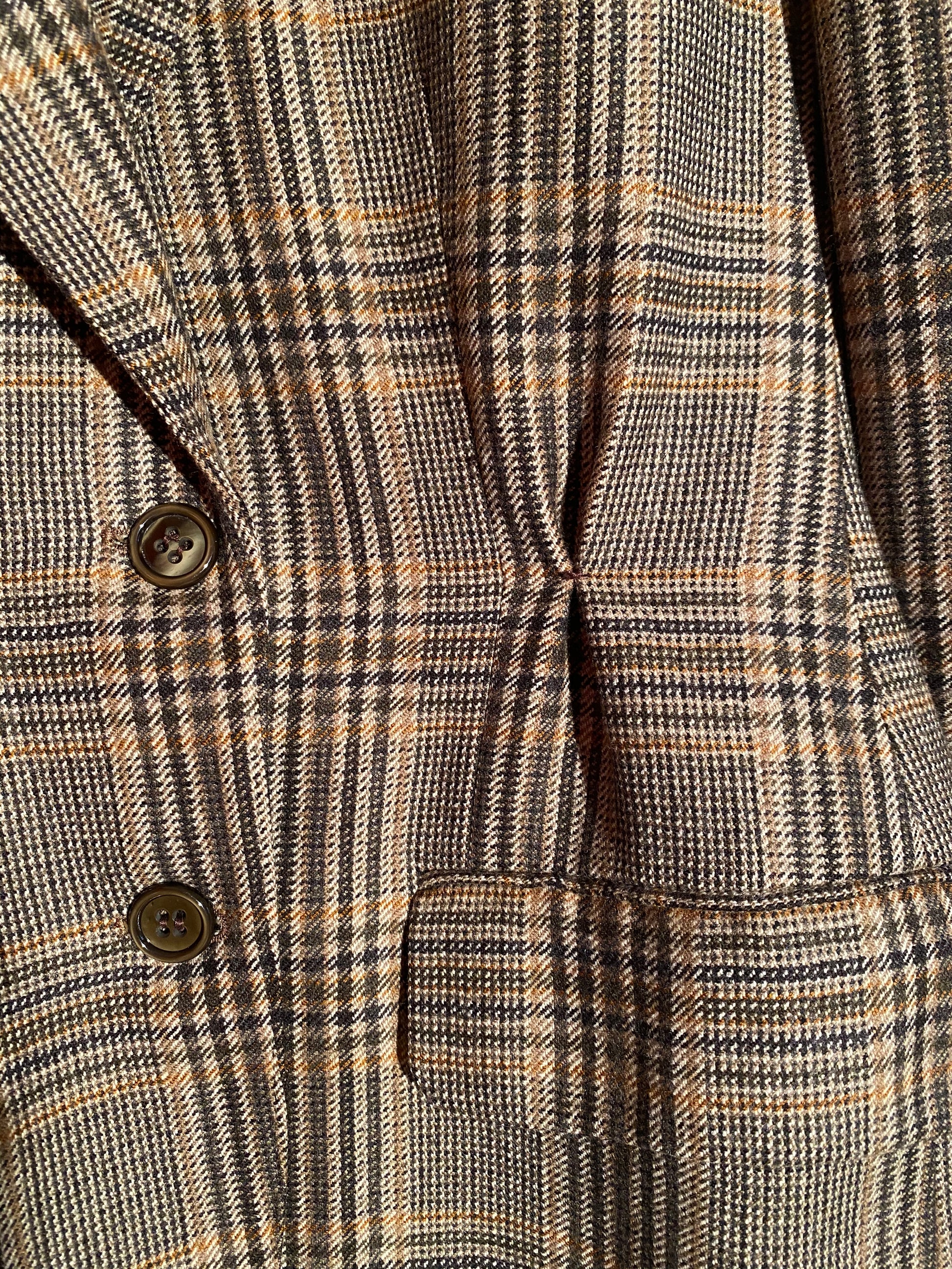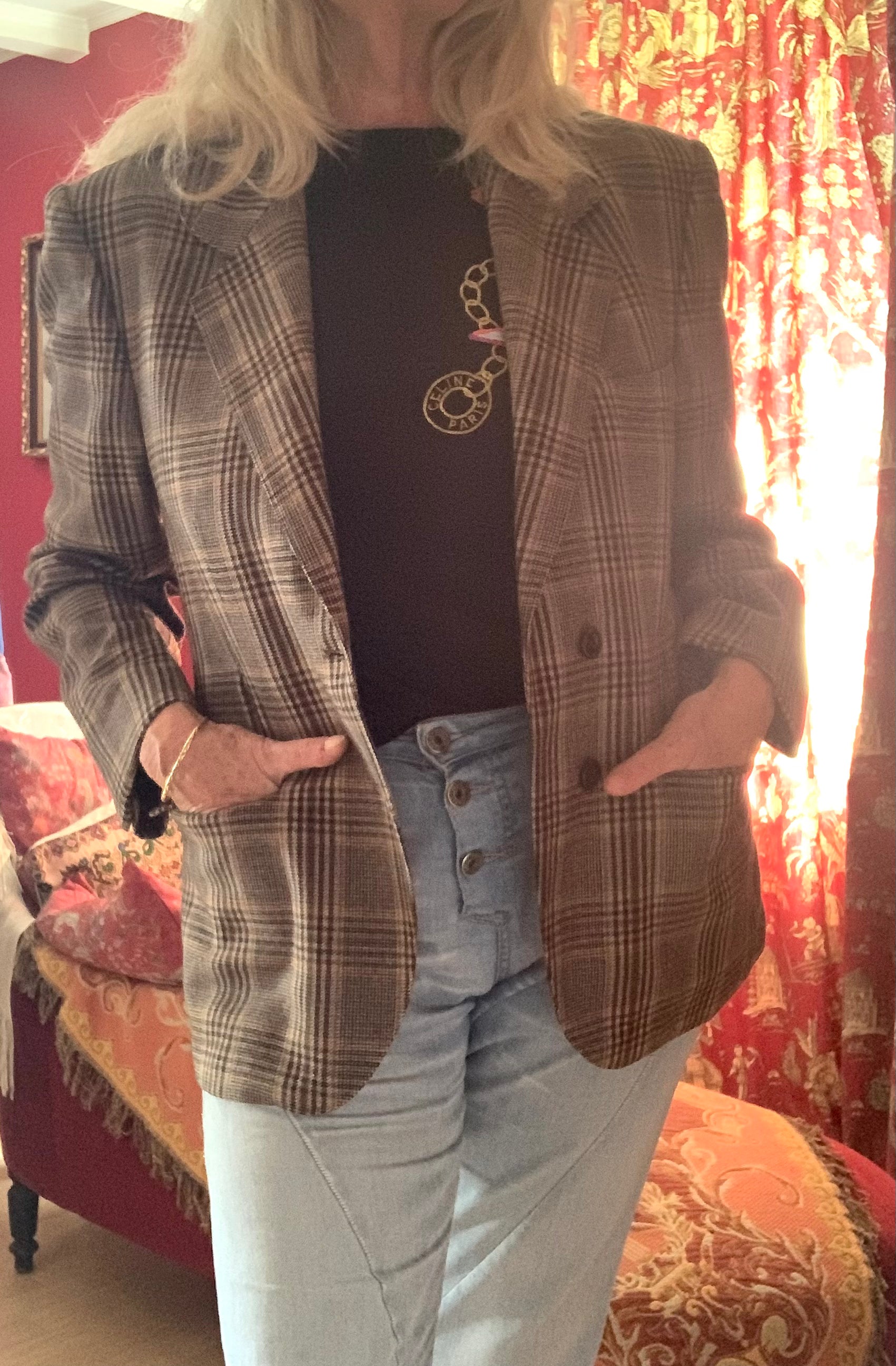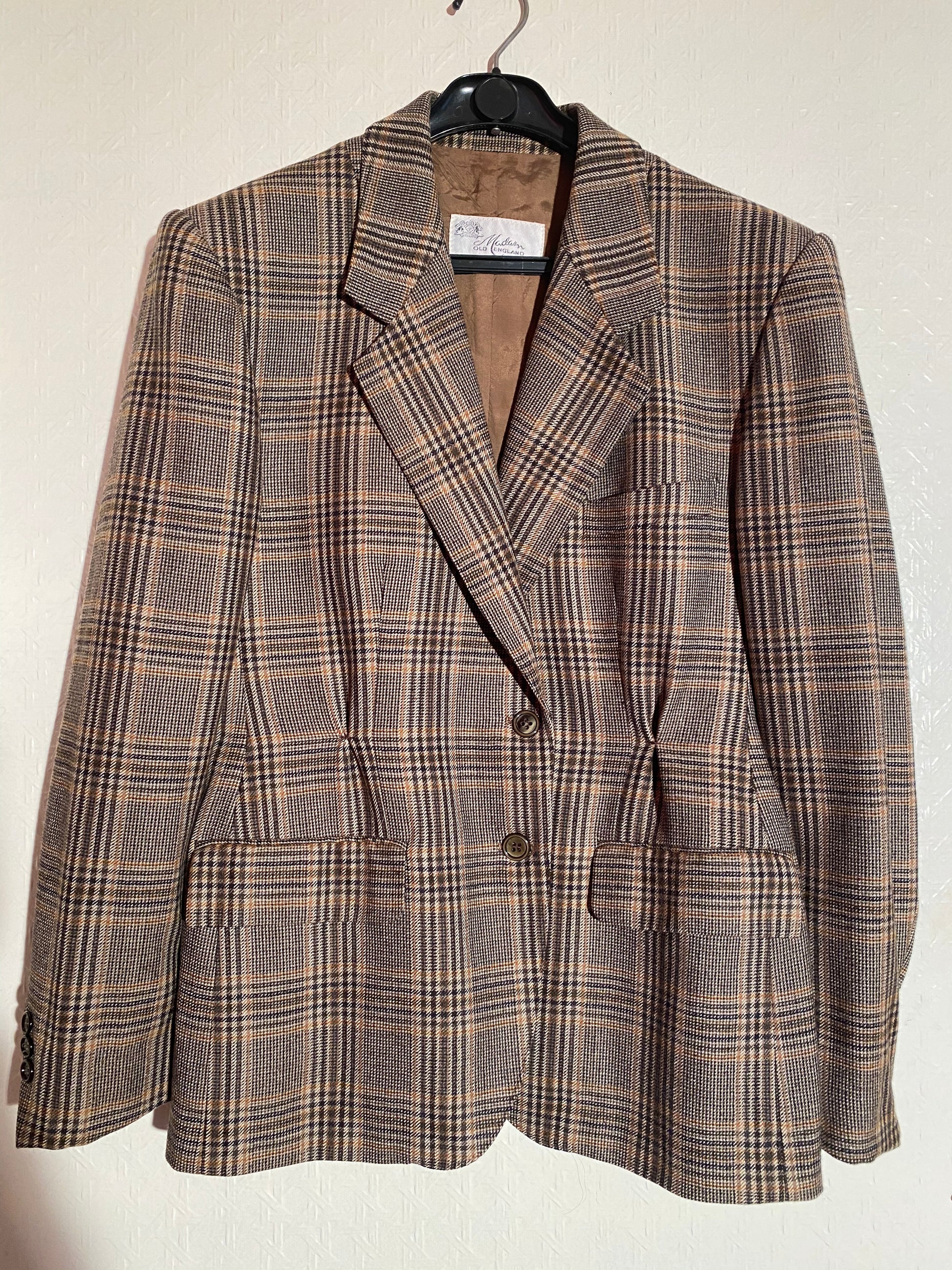Belle veste en laine , motif carreaux prince de Galles marron. Col tailleur et taille cintrée , pinces devant et dos pour bien la souligner. 2 poches avec rabats, et une côté cœur, fermée par 2 boutons. Bas des manches ouverts et terminés par petits boutons. Entièrement doublée.