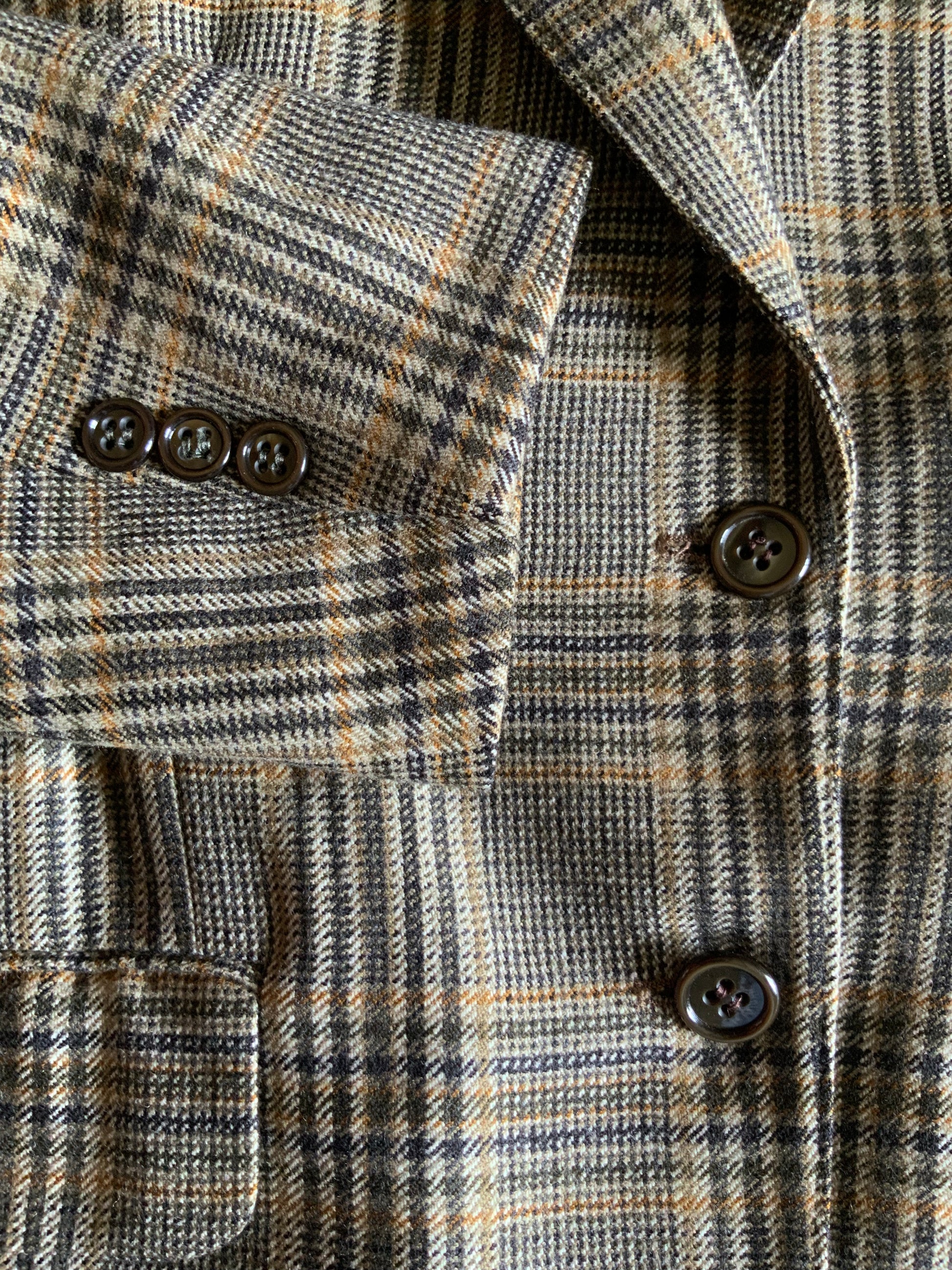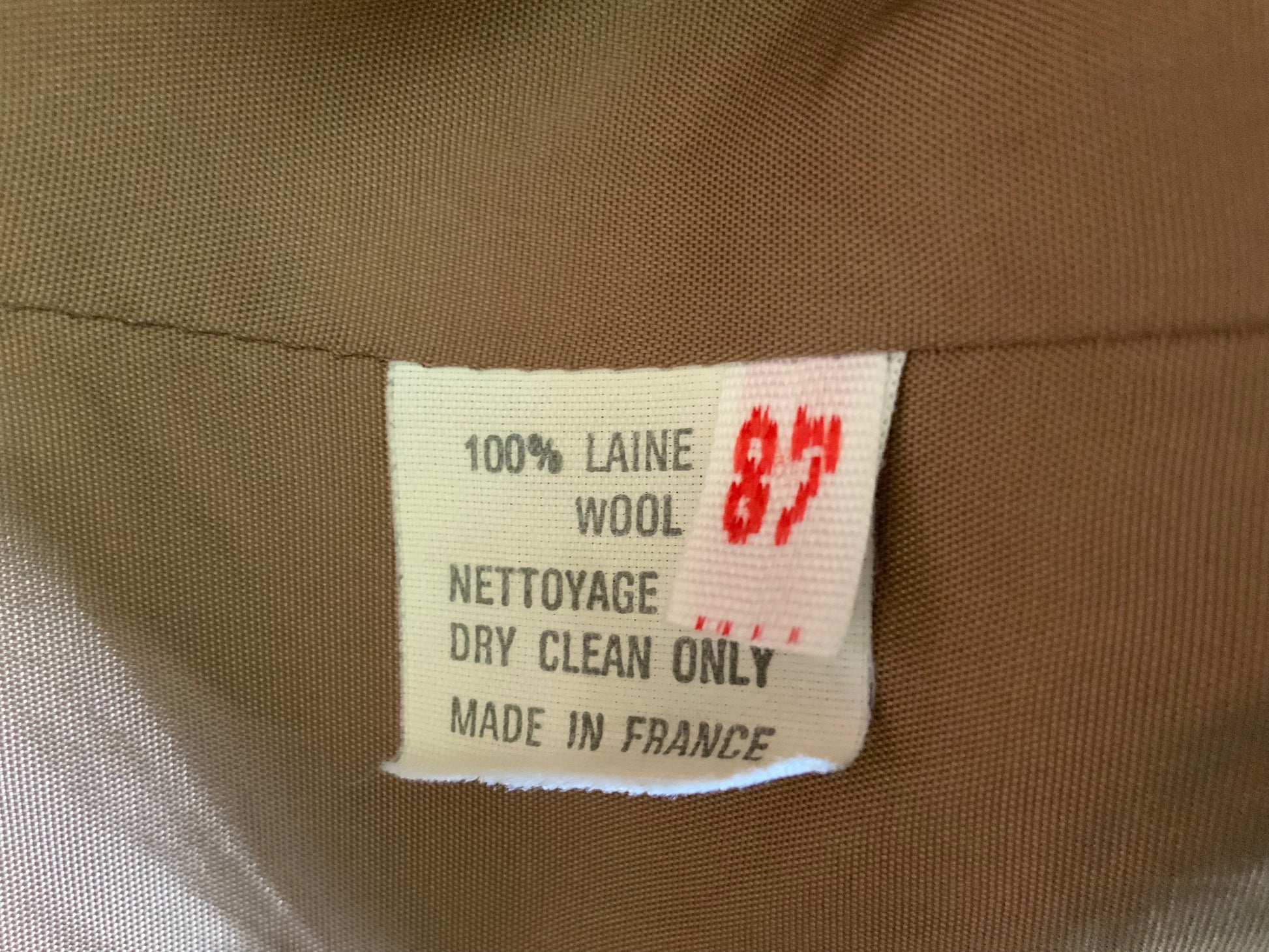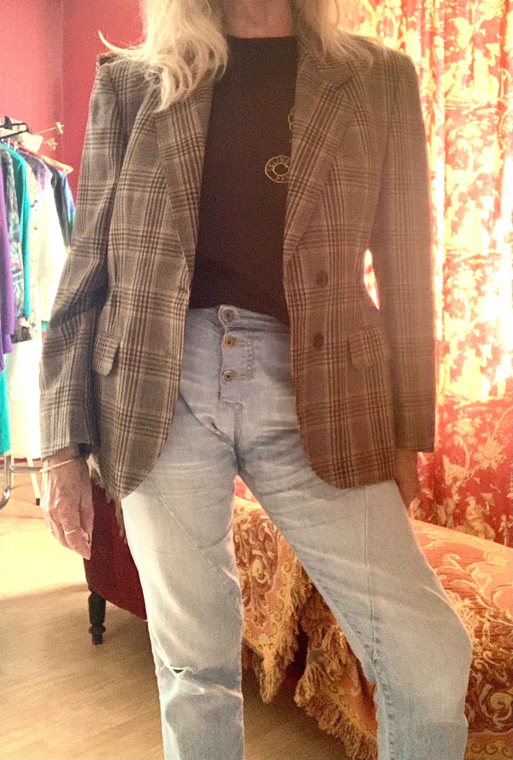 Belle veste en laine , motif carreaux prince de Galles marron. Col tailleur et taille cintrée , pinces devant et dos pour bien la souligner. 2 poches avec rabats, et une côté cœur, fermée par 2 boutons. Bas des manches ouverts et terminés par petits boutons. Entièrement doublée.